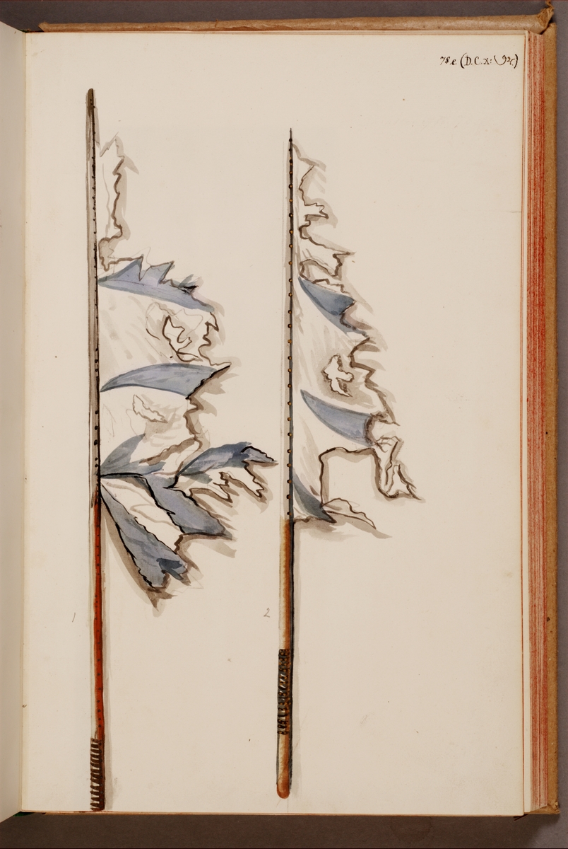 Avbildning i gouache föreställande fälttecken tagna som troféer av svenska armén. De avbildade fanorna finns inte bevarade i Armémuseums samling.