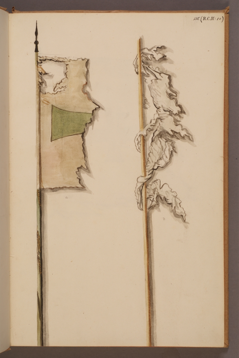 Avbildning i gouache föreställande fälttecken tagna som troféer av svenska armén. Fanan till vänster i bild finns bevarad i Armémuseums samling, för mer information, se relaterade objekt.