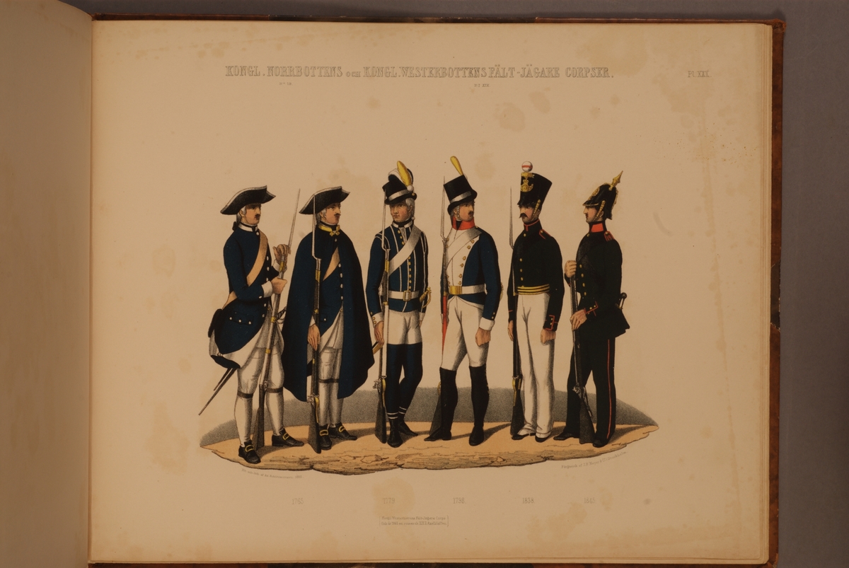 Plansch med uniform för Norrbottens och Västerbottens fältjägarkår för åren 1765-1845. Plansch i färgtryck efter original av Adolf Ulrik Schützercrantz. Ingår i planschsamlingen Svenska krigsmaktens fordna och närvarande munderingar.