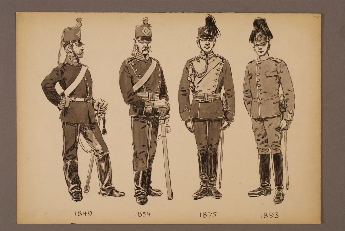 Plansch med uniform för Skånska dragonregementet för åren 1849-1893, ritad av Einar von Strokirch.