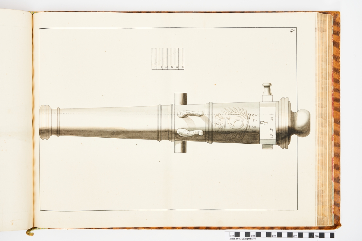 Avbildning föreställande dansk trofé med Kristian V:s vapen. Ingår i volym med avbildade äldre svenska eldrör förvarade på fästningar samt eldrör erövrade åren 1598-1679.