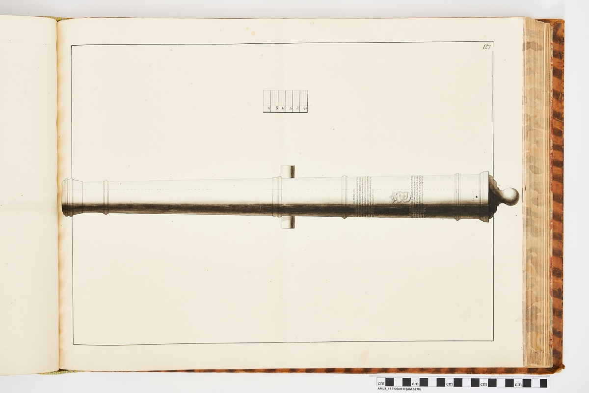 Titel: Avbildning föreställande dansk trofé med Kristian IV:s vapen. Ingår i volym med avbildade äldre svenska eldrör förvarade på fästningar samt eldrör erövrade åren 1598-1679.