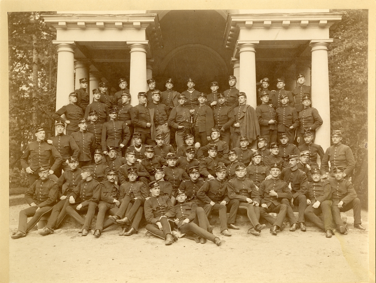 Titel: Kadetter samlade framför "Dianas" tempel vid Karlberg.
