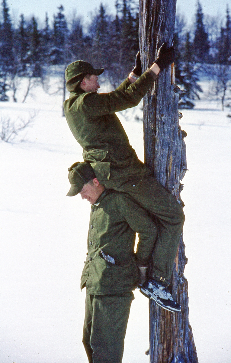 Titel: Värpliktiga samlar ved för att göra upp eld under vinterövning. I 21 Västernorrlands Regemente.