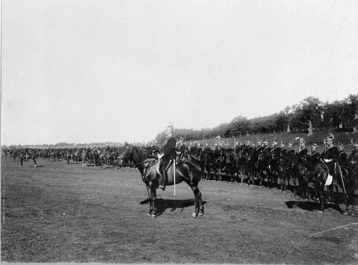 Livregementets dragoner uppställda till häst på Ladugårdsgärdet, 1890-tal.