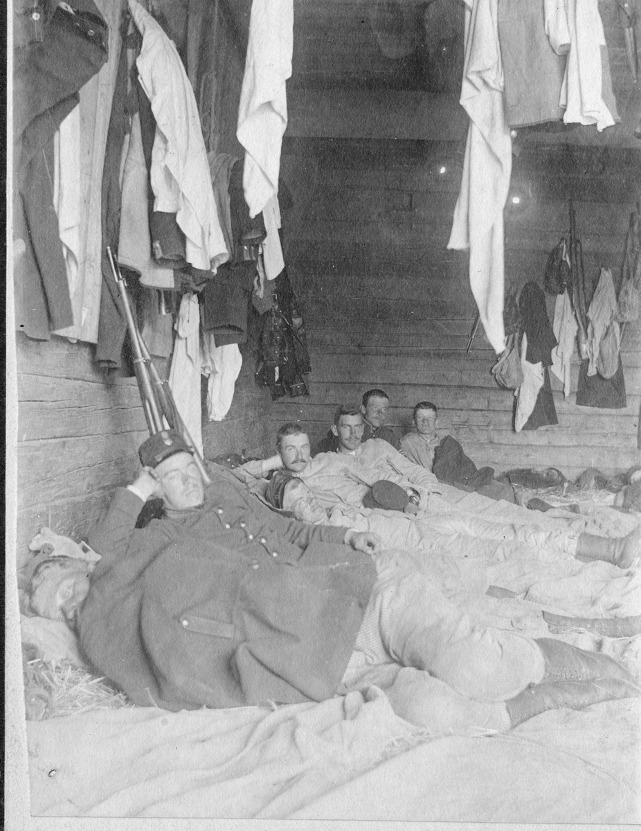 Titel: Soldater ur Hälsinge regemente I 14 har slagit läger i lada.