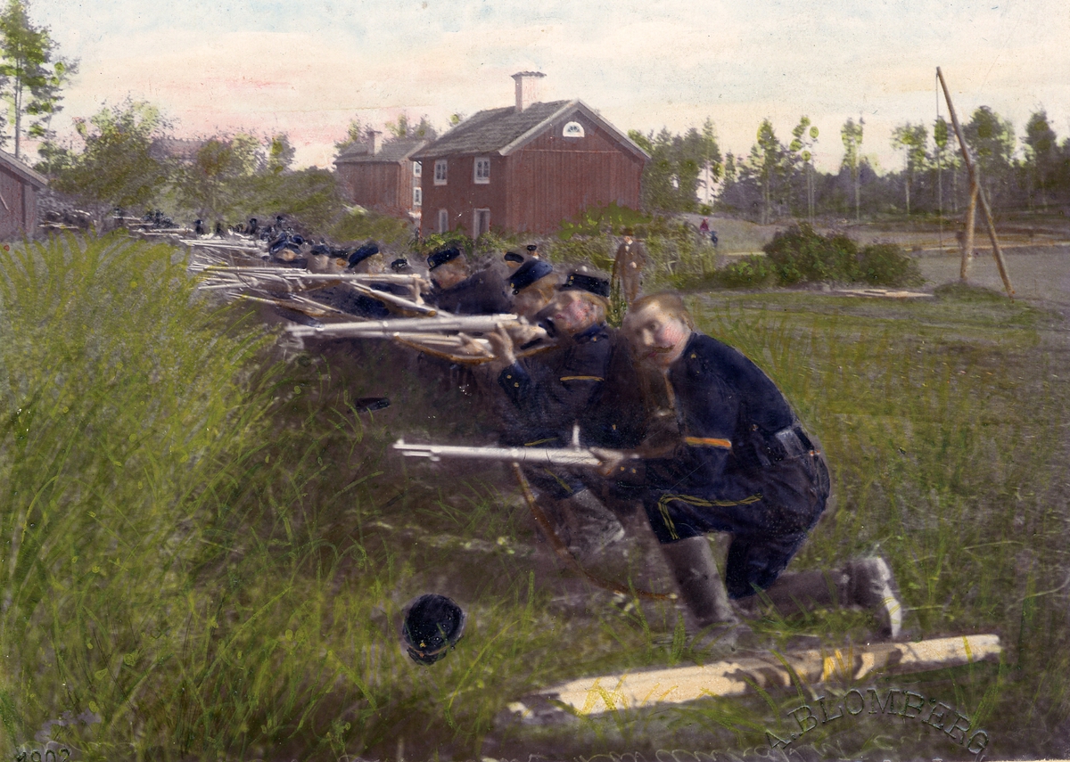 Soldater ur Andra Svea artilleriregemente A 5 ligger skjutklara med gevär i skyttelinje vid bondgård(?). Civila åskådare ser på i bakgrunden. Färglagt foto från 1902.