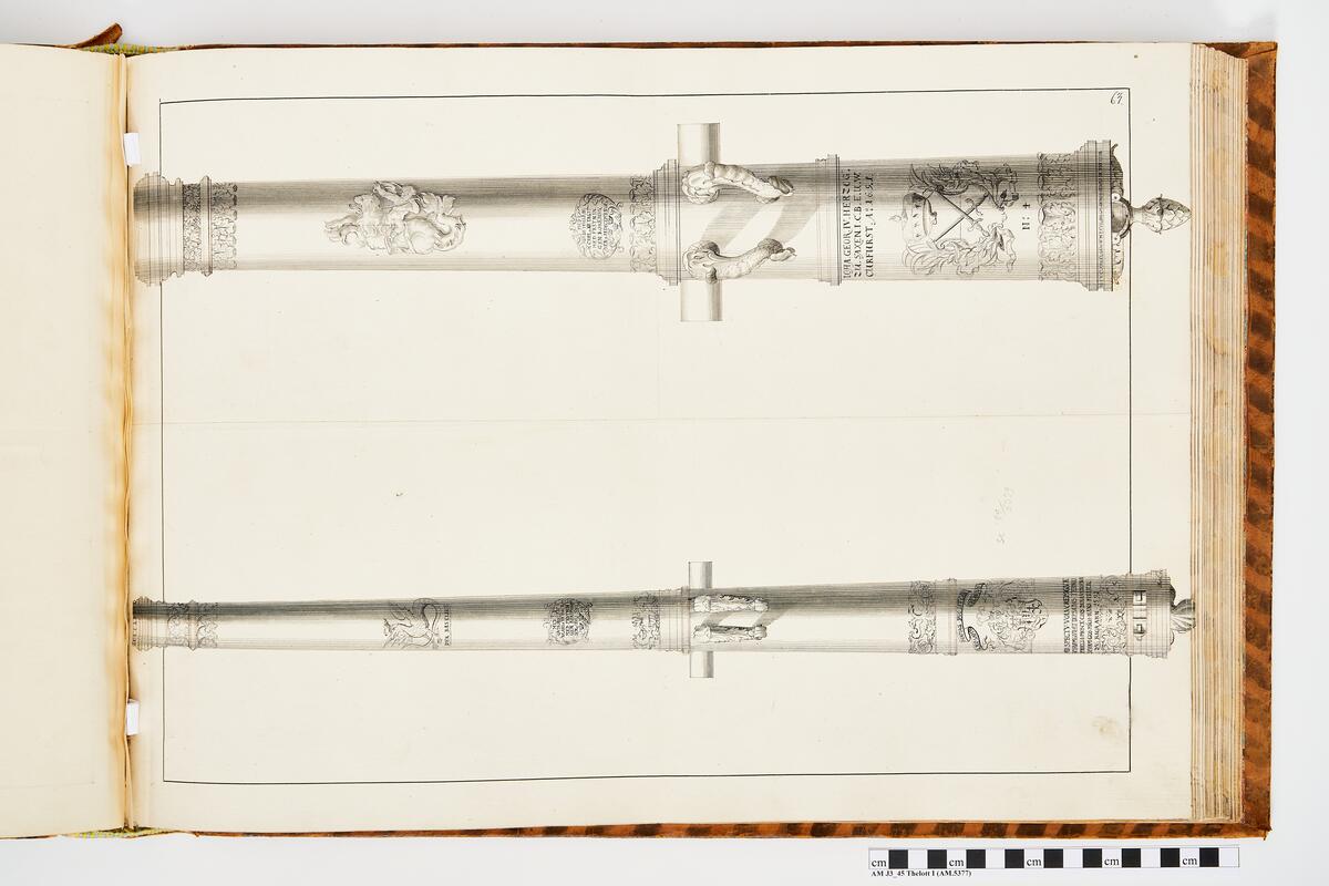 Titel: Avbildning föreställande eldrör tagna som troféer av den svenska armén med fästningen Kokenhusen 11 juli 1701. Ingår i volym med avbildade kanontroféer tagna åren 1700-1702.
