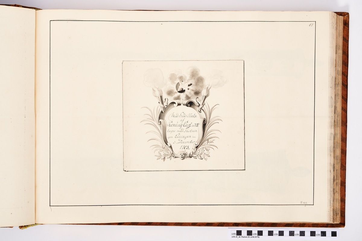 Kartusch till bokverk med avbildningar föreställande eldrör tagna som troféer av den svenska armén åren 1703-1706, utförda av syskonen Anna Maria och Philip Jakob Thelott. Avser troféer tagna med fästningen Elbingen den 3 december 1703.