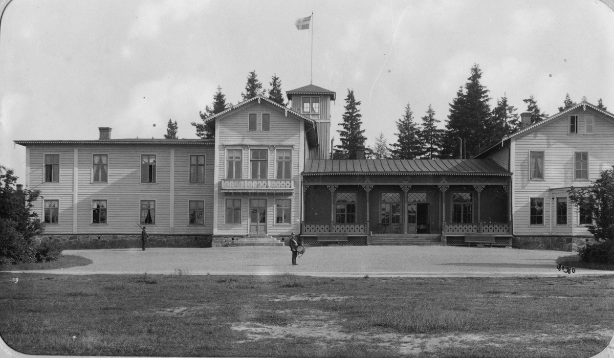 Vakt och trumslagare står utanför logement på Älvsborgs regementes, I 15, övningsplats Fristad hed. Unionsflaggan är hissad på tornet i bildens mitt.