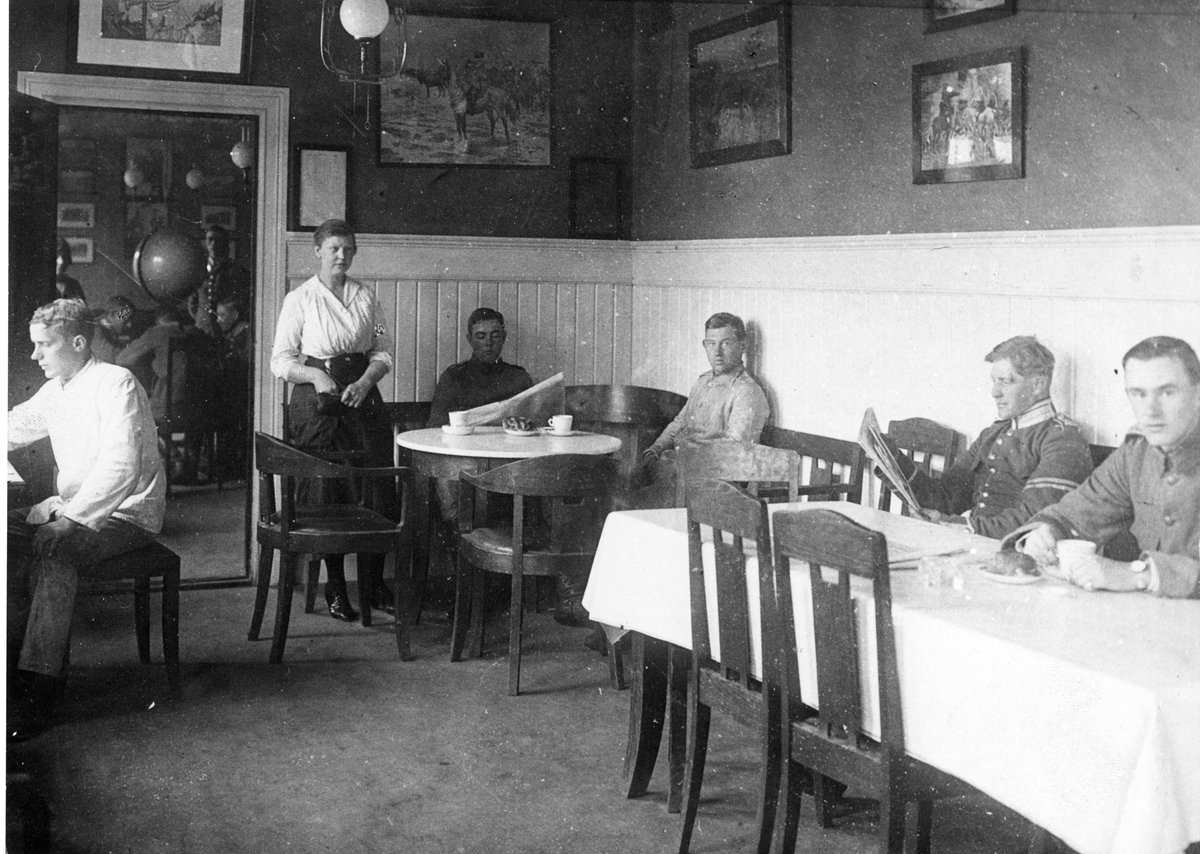 En grupp soldater från Livgardet till häst, K 1, sitter kring bord i korpralsmässen. Ett kvinnligt mässbiträde står vid dörren redo att ta betalt av de närvarande.