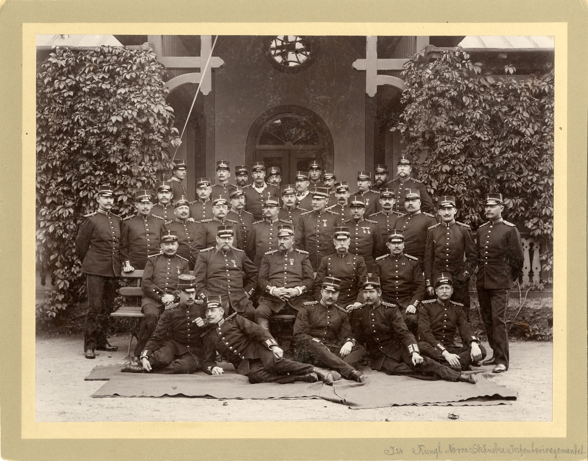 Grupporträtt av officerare vid Norra skånska infanteriregementet I 24 med överste Oscar Waldemar Falkman (i mitten) 1895.