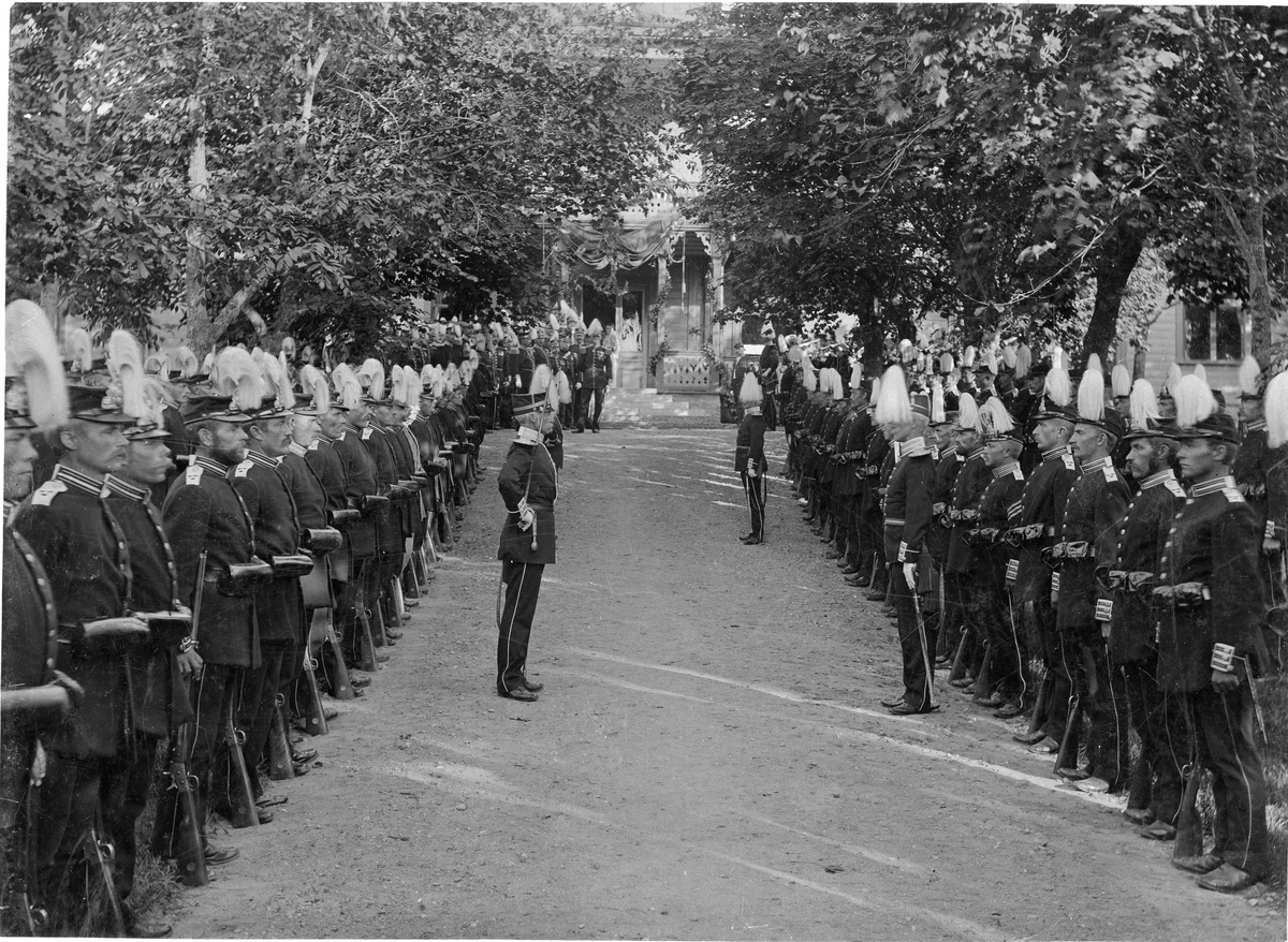 Livkompaniet vid Livregementet till fot (I 3) paraderar vid ingången till officerarnas matpaviljong den 29/8 1897, då officerskåren gav middag för sin avgående chef, överste Johan Lilliehöök. I bakgrunden spelar musikkåren.