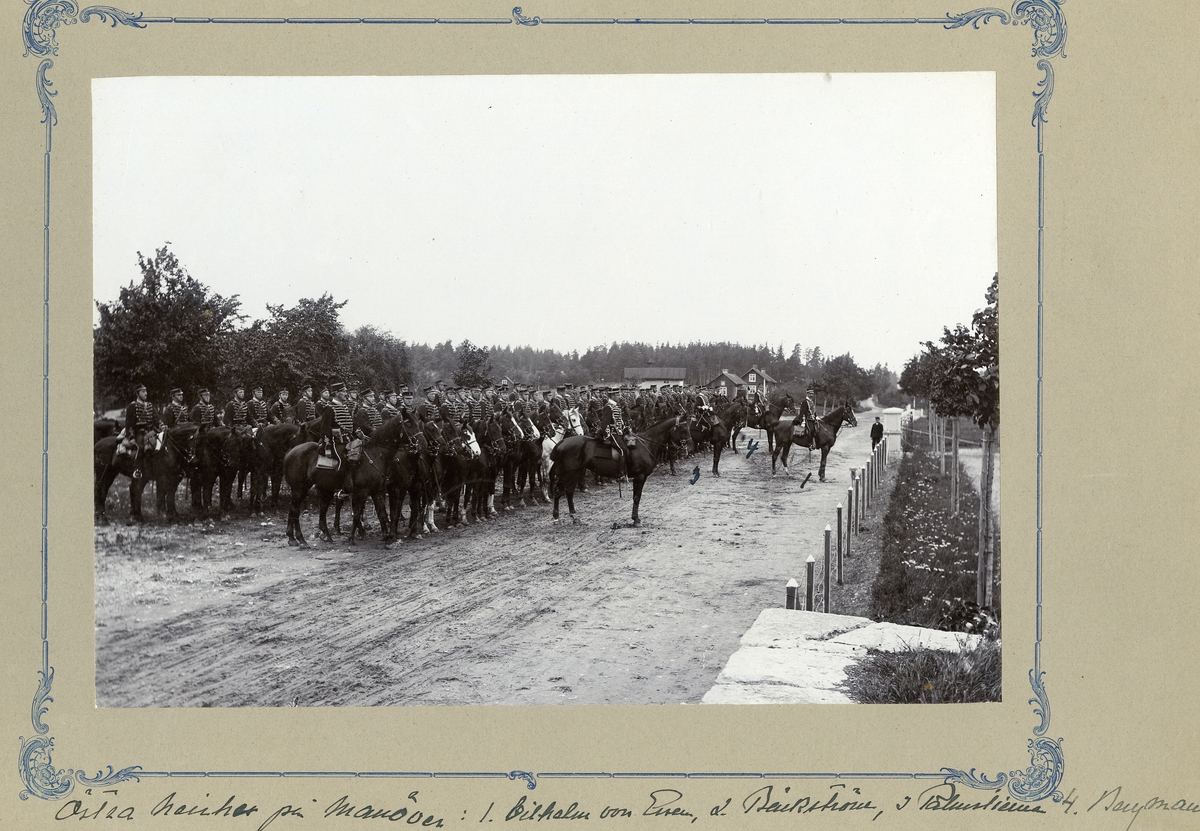 Soldater ur Livregementets husarer K 3 uppställda till häst på Sanna hed. Markerad med nr 1 på bilden är löjtnant Wilhelm von Essen, nr 2 underlöjtnant Johan Richard Bäckström, nr 3 löjtnant Nils Otto Magnus Palmstierna, nr 4 ? Bergman,