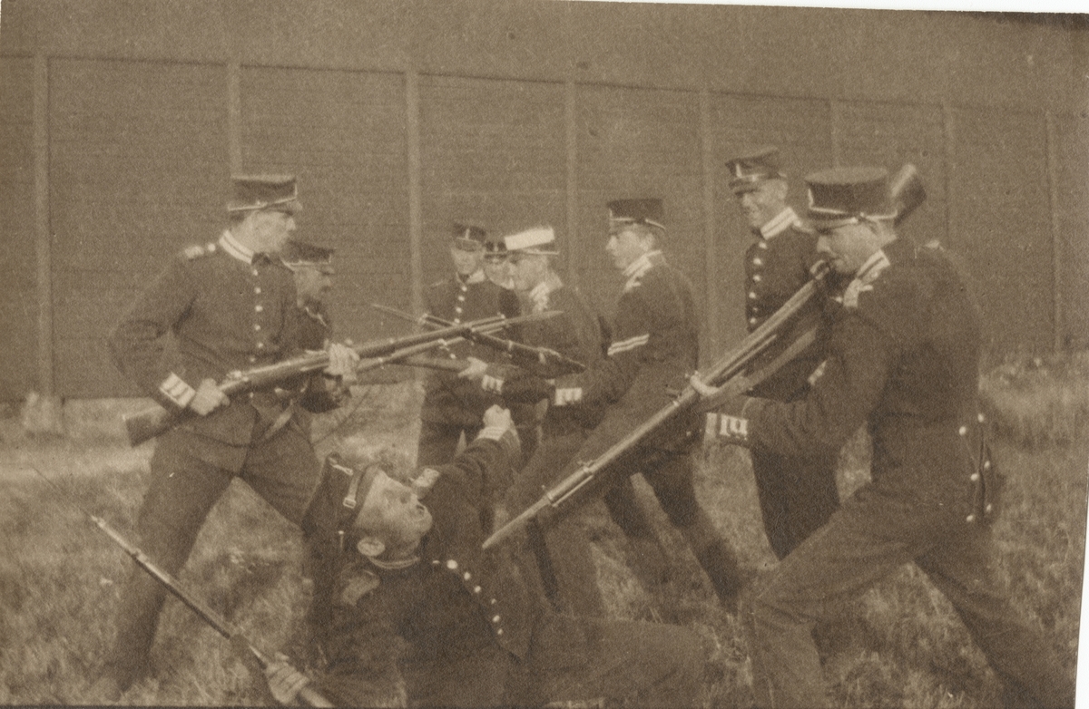 Titel: Soldater från Göta livgarde i ett dramatiserad stridsscen.