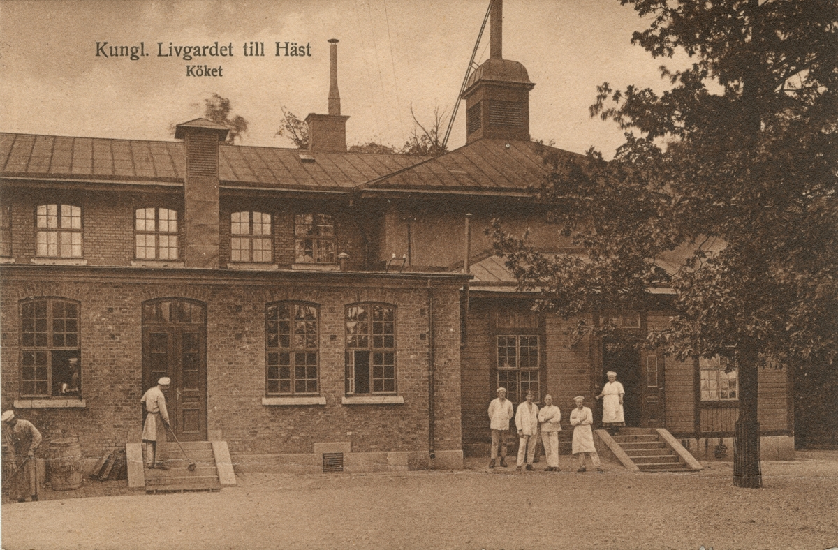 Titel: Exteriörbild på Livregementet till häst matsal med vitklädda kockar utanför byggnaden.
