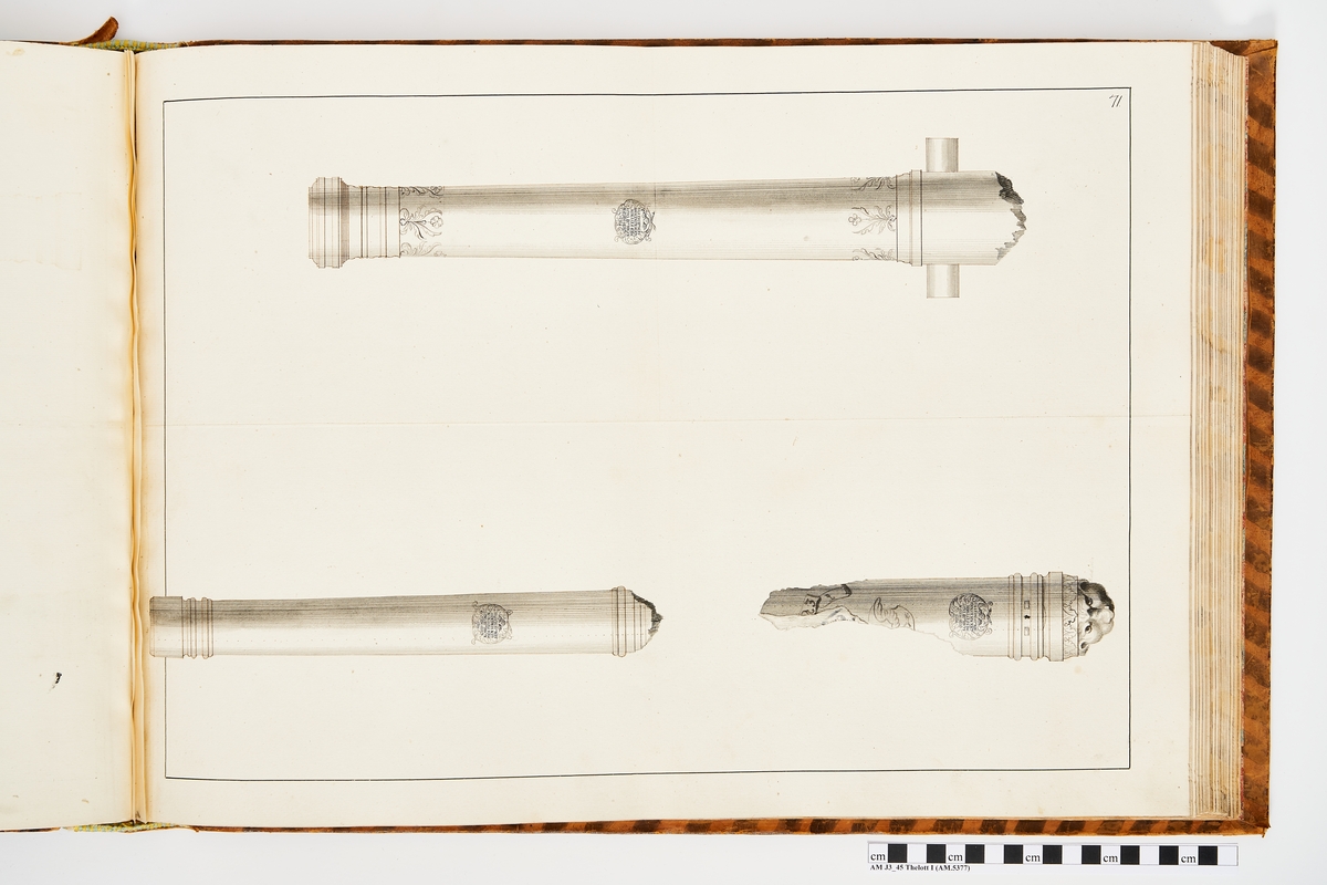 Avbildning föreställande eldrör tagna som troféer av den svenska armén med fästningen Kokenhusen 11 juli 1701. Ingår i volym med avbildade kanontroféer tagna åren 1700-1702.