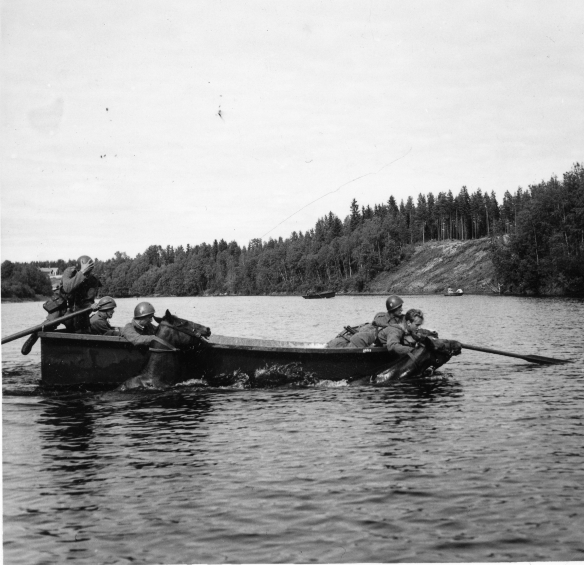 Värnpliktiga leder en häst över vattenled med båt. Norrlands dragonregemente K4, Umeå, 1955-1956.