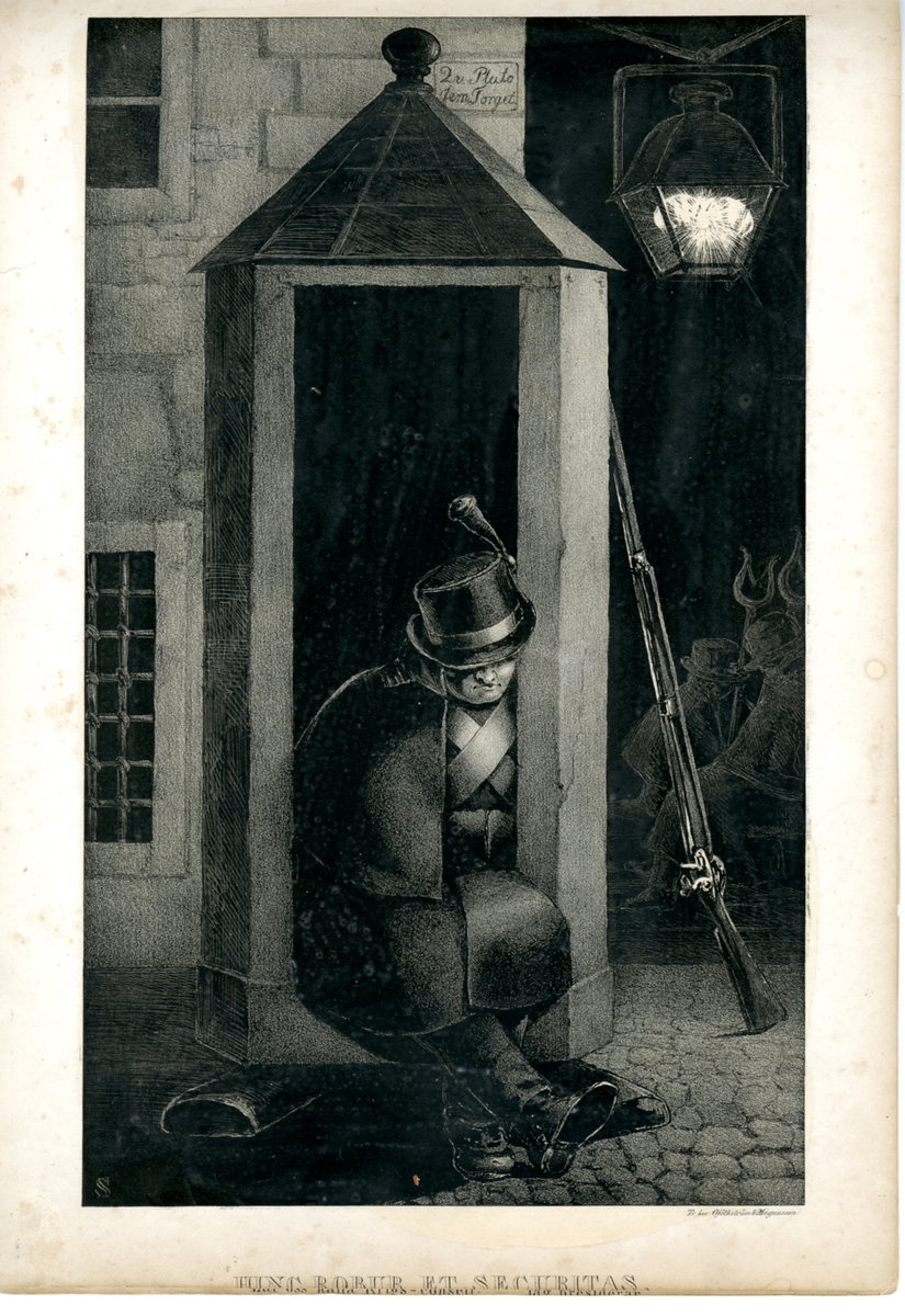 Soldat har somnat inne i vaktkur. Litografi i svartvitt efter original av Adolf Ulrik Schützercrantz. Ingår i planschsamlingen Scener ur soldatlivet.