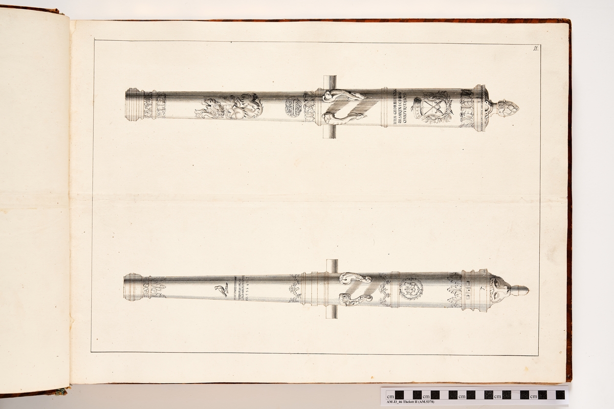Avbildning föreställande eldrör tagna som troféer av den svenska armén med fästningen Torn den 4 oktober 1703. Ingår i volym med avbildade kanontroféer tagna åren 1703-1706.