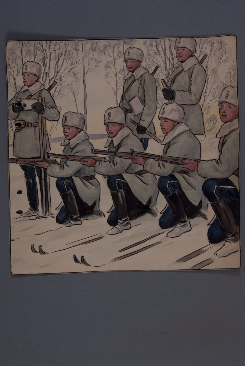 Soldater på skidor i vinteruniform, teckning av Einar von Strokrich.