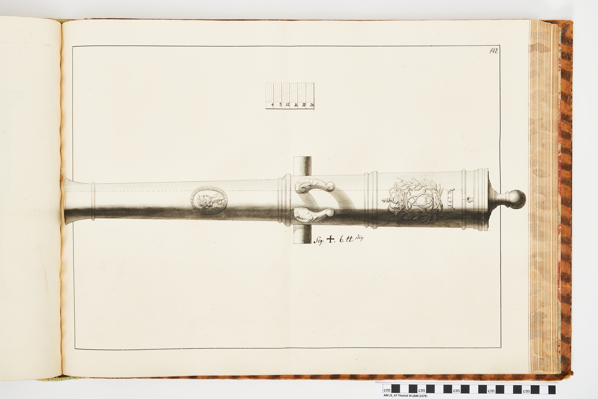 Avbildning föreställande dansk trofé med Kristian IV:s vapen. Ingår i volym med avbildade äldre svenska eldrör förvarade på fästningar samt eldrör erövrade åren 1598-1679.