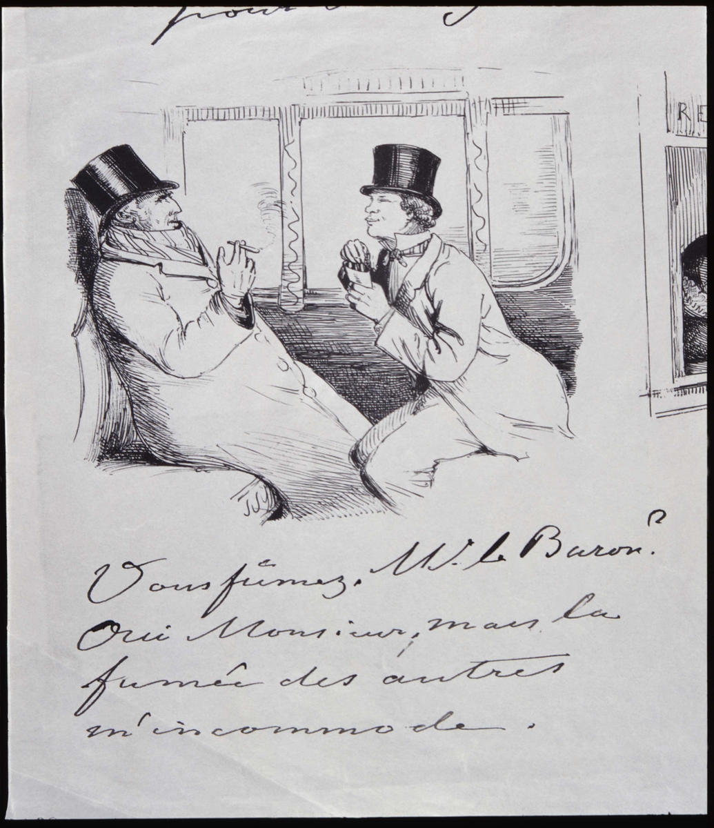 Titel: "Vous fumez, Monsieur le Baron? Oui Monsieur, mais la fumêe des autres m'incommode." Scen i tågkupé. Tusch av Fritz von Dardel