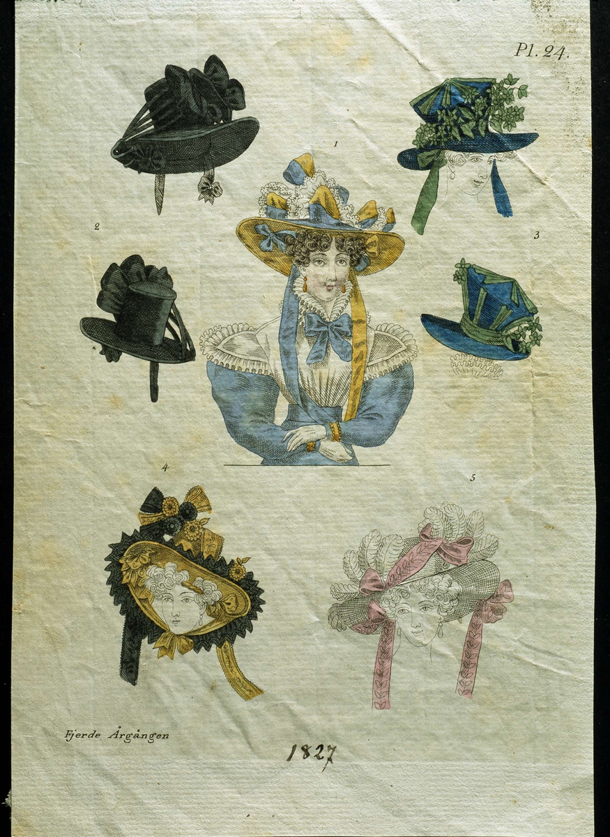 Hattmode. Modeplasch ur Magasin för Konst, Nyheter och Mode från 1827.
