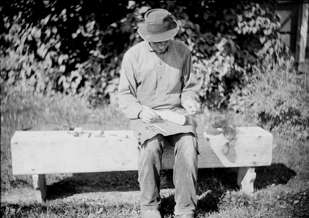 Borstmakare. En tåt av hästtagel drages i sitt läge med hjälp av ett snöre. Mangskogs socken i Värmland.