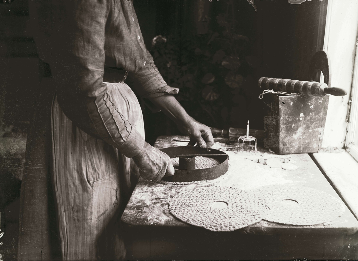 Knäckebrödsbakning. Kvinna stansar hål ur degen med ett brödmått. Bjurbäcken, Manskogs socken, Värmland.