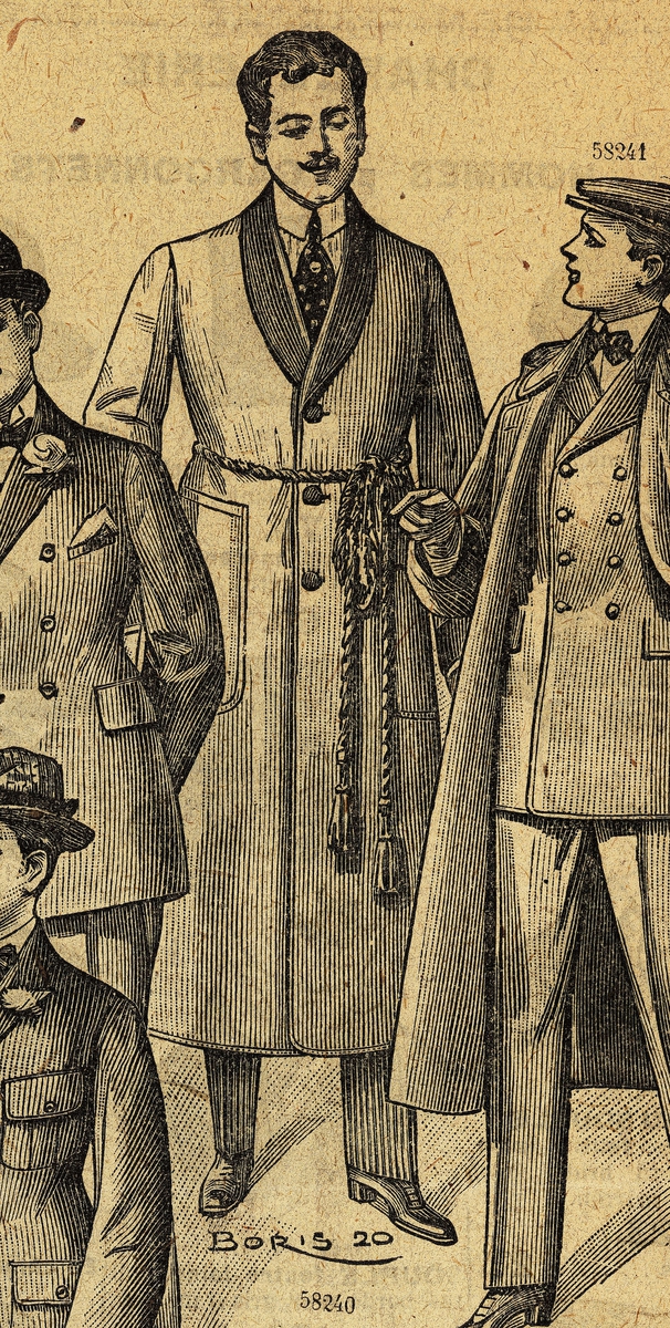 Fransk modeplansch från 1920, detalj. Män i kavajer, rock och rökrock. Au Bon Marché, Paris