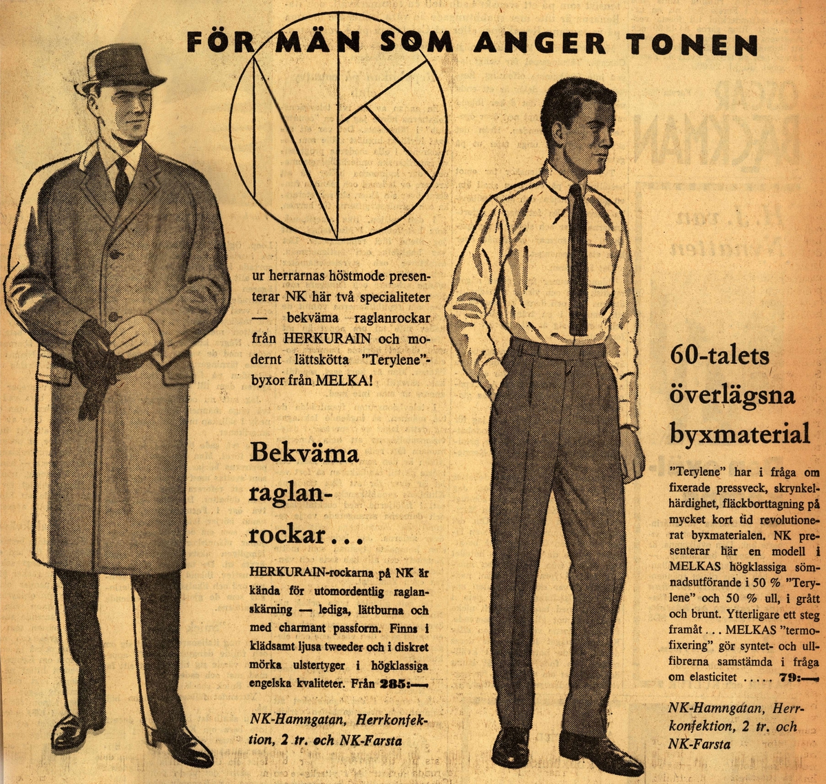 Annons för Nordiska Kompaniet. "För män som anger tonen" Bekväma raglanrockar.