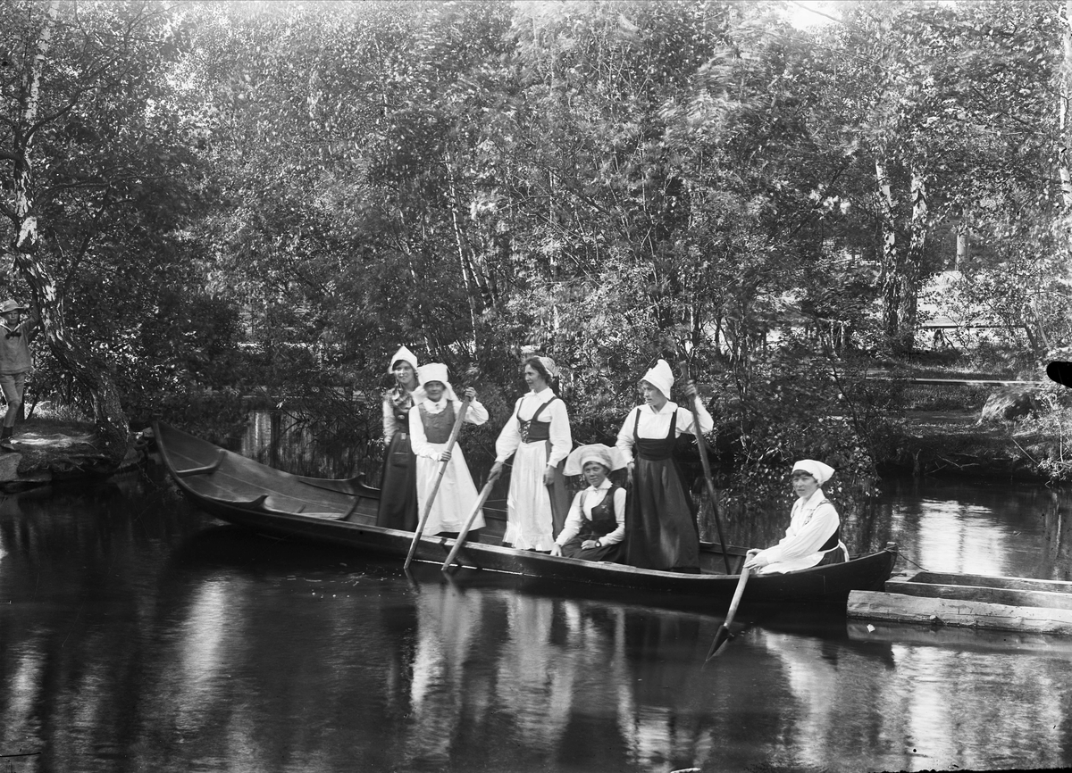 Skansen. Sex kvinnor i folkdräkter i båt. (Offerholmen?)