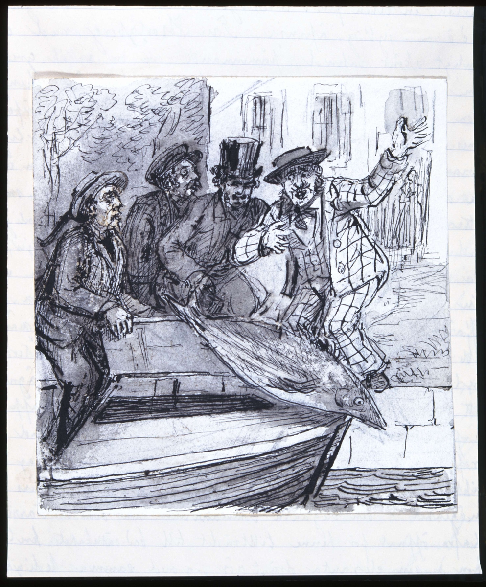 Fyra herrar som fiskar. Tuschteckning av Fritz von Dardel, 1874