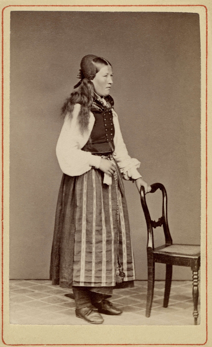 Kvinnna visar en sockendräkt med randigt förkläde.