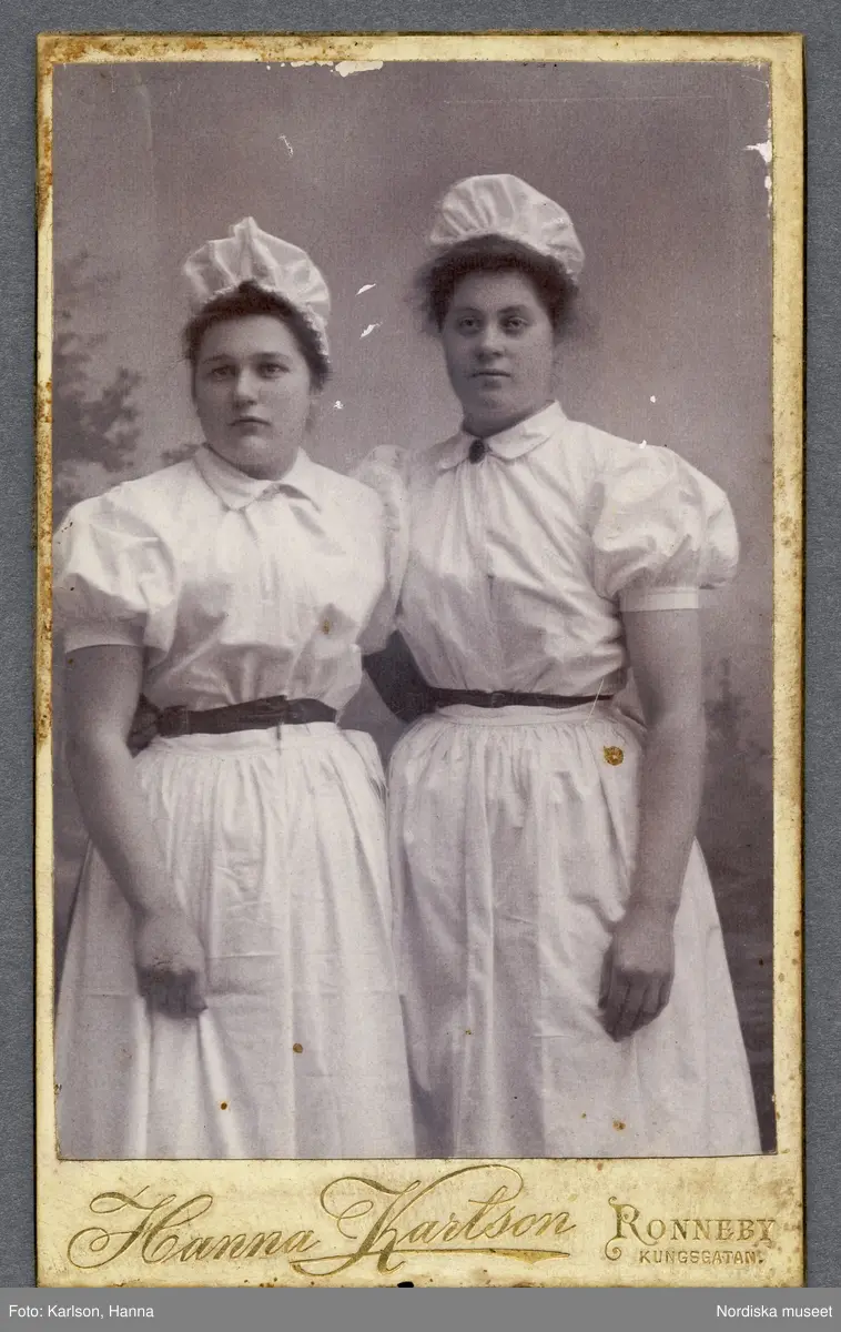 Två unga kvinnor i likartade vita dräkter. Kabinettkort.