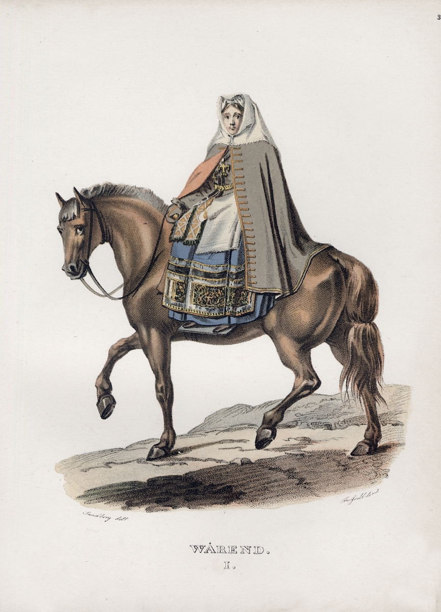 En högtidsklädd kvinna från Värend i Småland som bär en fotsid ärmlös kappa av ålderdomligt snitt ridande på en häst. Teckning av J. G. Sandberg för bildverket "Ett år i Sverige" (1827).