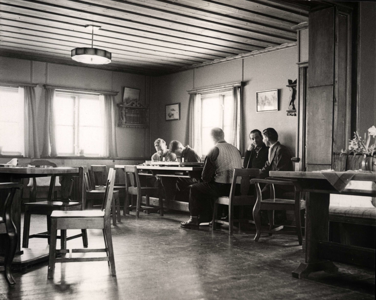 Sylarnas fjällstation, Jämtland. Interiör matsalen. En grupp män vid ena bordet.