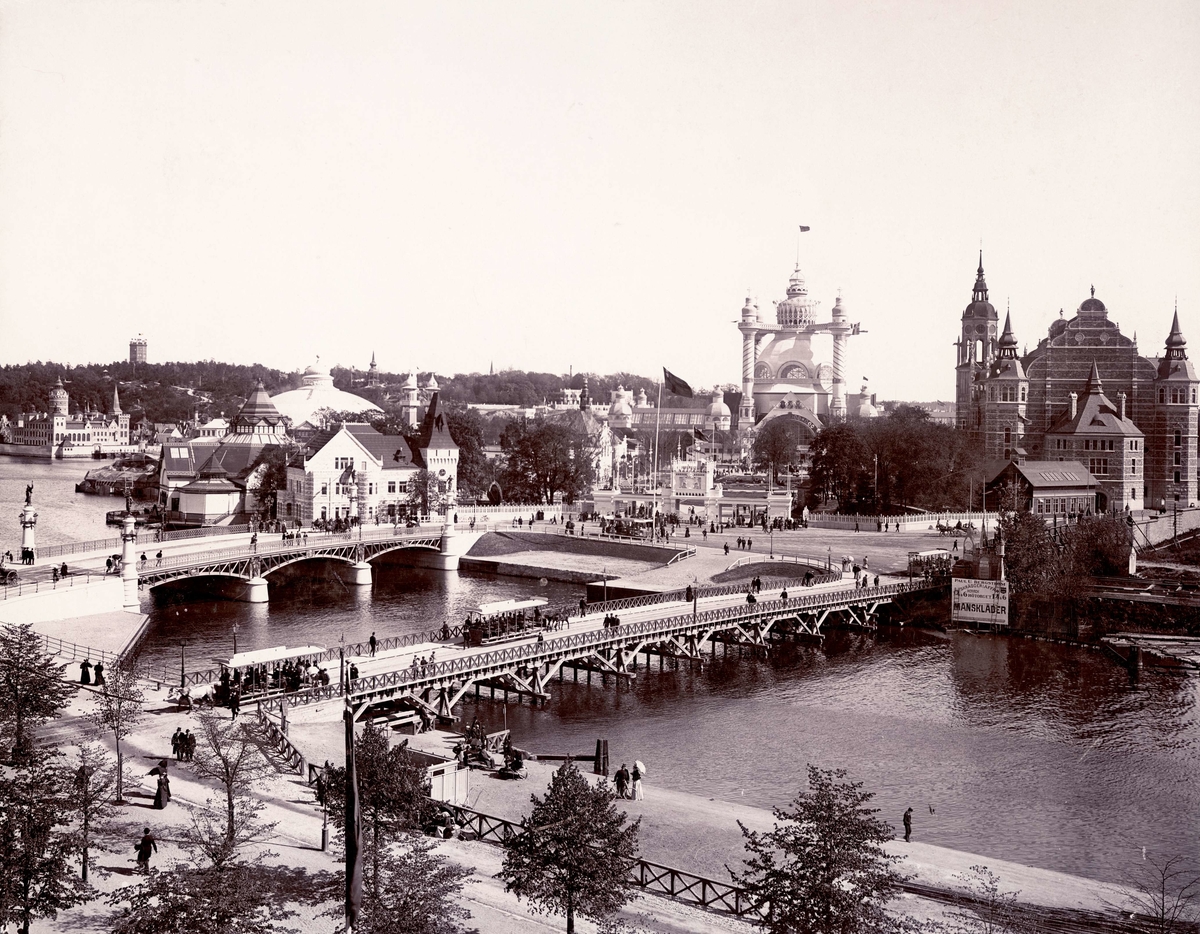 Konst- och Industriutställningen i Stockholm 1897, totalvy från Strandvägen mot Skansen.