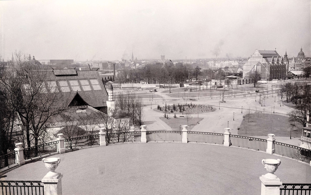 Utsikt från Oscarsterassen. Nordiska museet under byggnad.