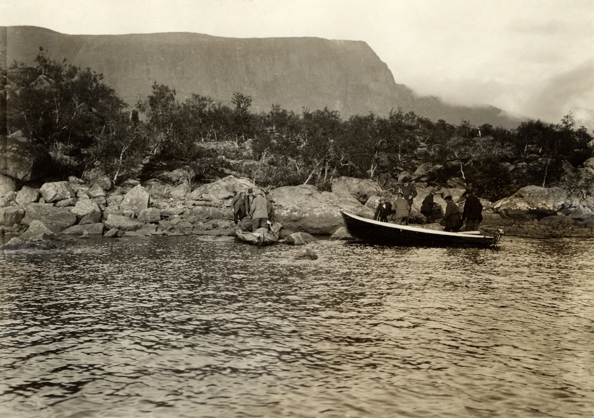 Män anländer med två båtar till Akkajaures strand vid Vaisaluokta.