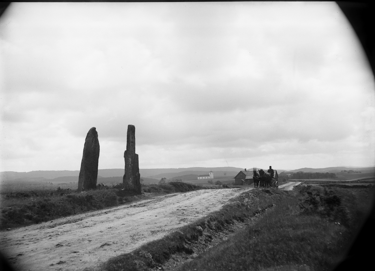 Vy. Asige hed med Asige kyrka i bakgrunden och de två bautastenarna som kallas "Hagbards galge" i förgrunden. På vägen en hästskjuts. Gården som skymtar bakom är Asigegården. Före 1890.