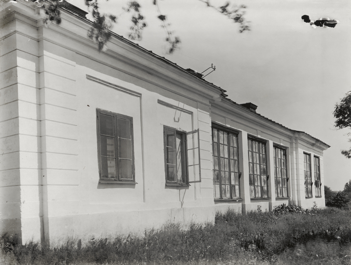 Åkeshof. Orangeriet, nummer 8, södra fasaden. Har varit gulvit med skära pilastrar, nu helvit puts. Bromma socken, Sollentuna härad, Uppland.