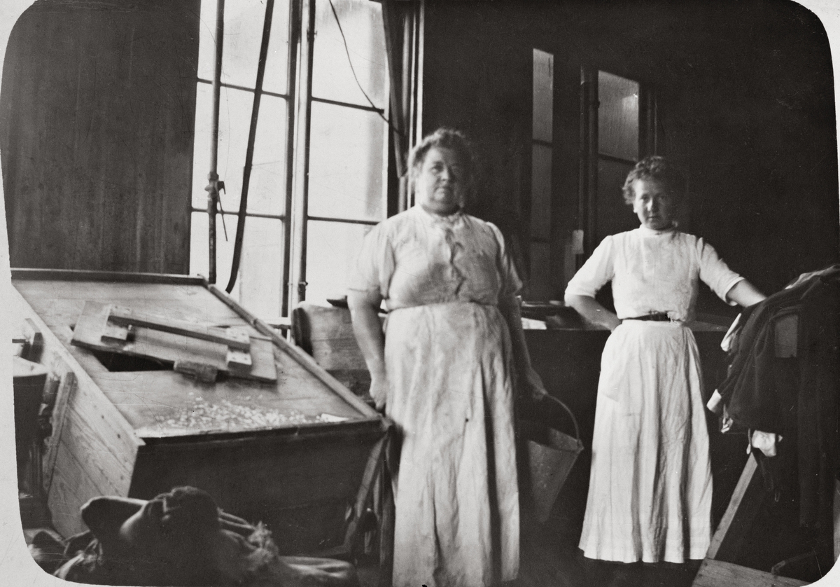 Vaggan vid Saltsjöbadens tvättinrättning. Två kvinnor, troligen tvätterskor, står intill.
