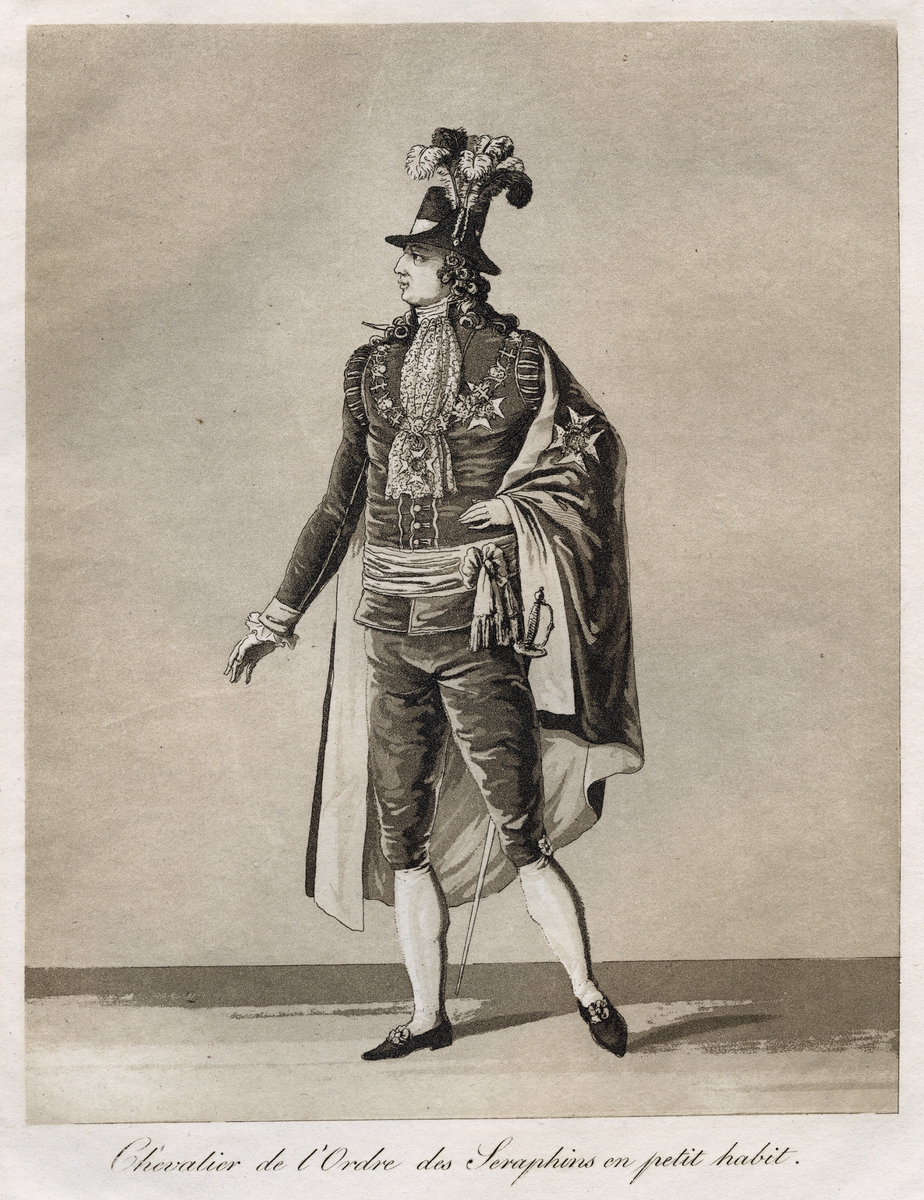 "Chevalier de l'Ordre des Seraphins en petit habit." Lilla Serafimerdräkten. Akvatint trol. av J A Aleander, 1780-tal.