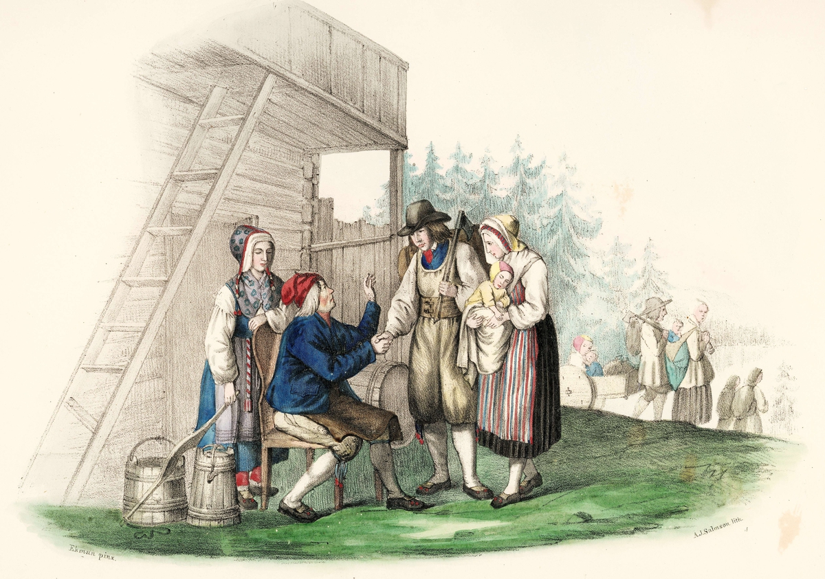 Litografi företällande en grupp människor i allmogedräkt utanför en timrad byggnad. "Afskedet", illustration av R W Ekman ur Sv. National drägter, 1847. "Ekman pinx A.J. Salmson lith" (Axel Jacob Salmson).