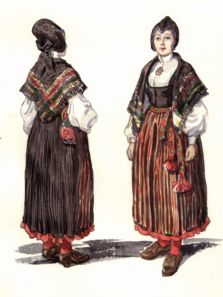 Högtidsdräkt för gift kvinna, Järvsö socken, Hälsingland. Akvarell av Emelie von Walterstorff.