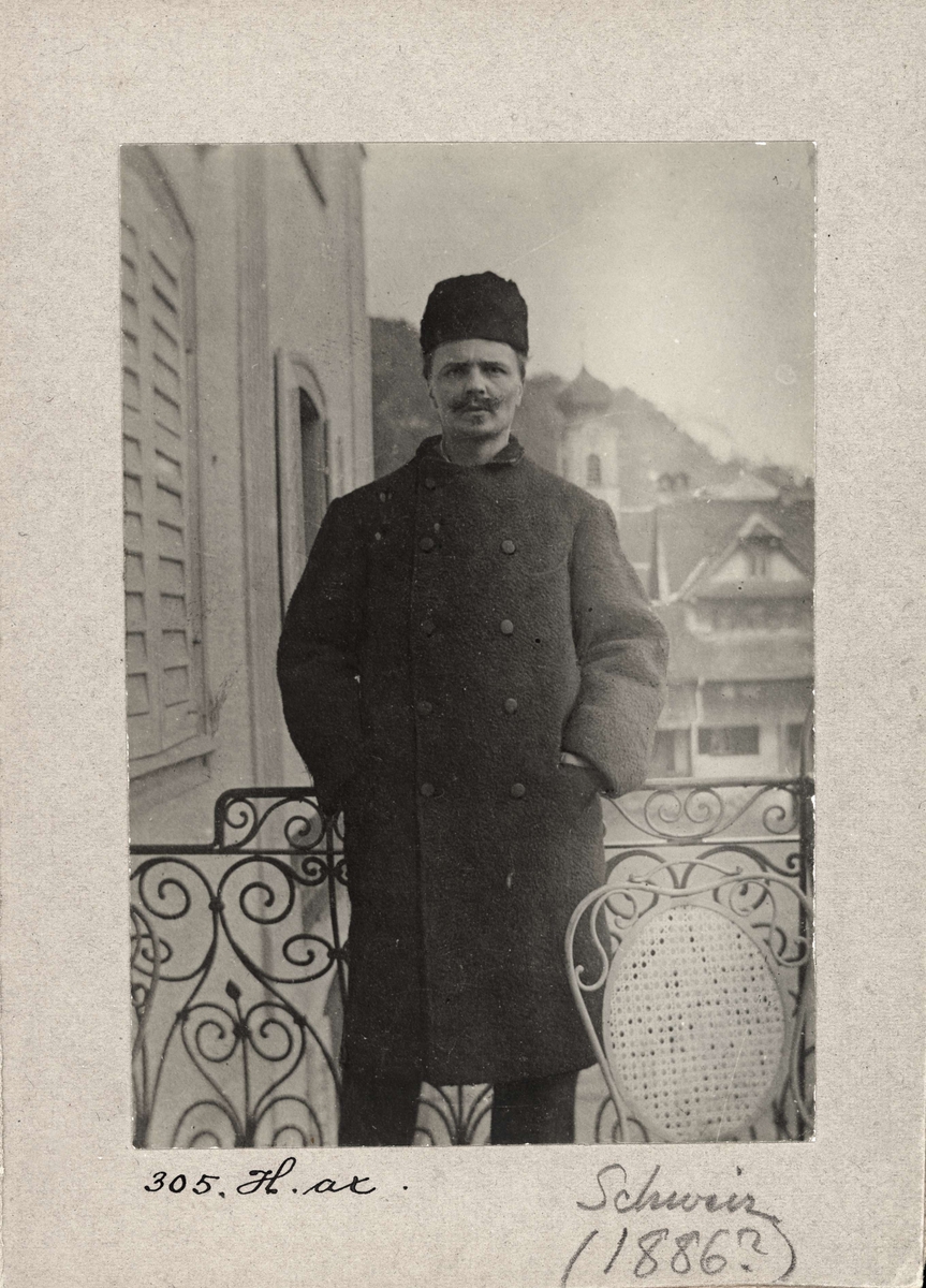 Författaren August Strindberg klädd som "rysk nihilist" i persianmössa och vinterrock. Självporträtt från Gersau, Schweiz.
