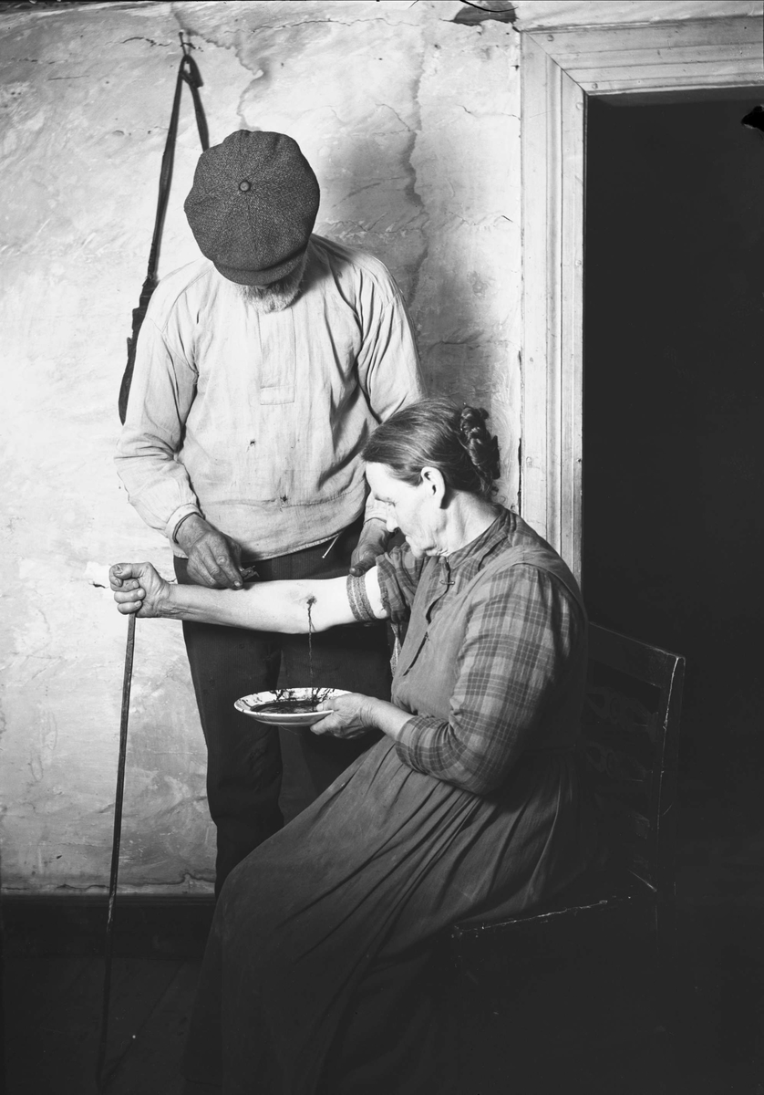 Sjukvård, åderlåtning. Äldre kvinna har snört åt armen och låter blod rinna från ett hål i armvecket ner på ett fat. Hon får hjälp av en man som står vid hennes sida. Värmland, Mangskogs socken.