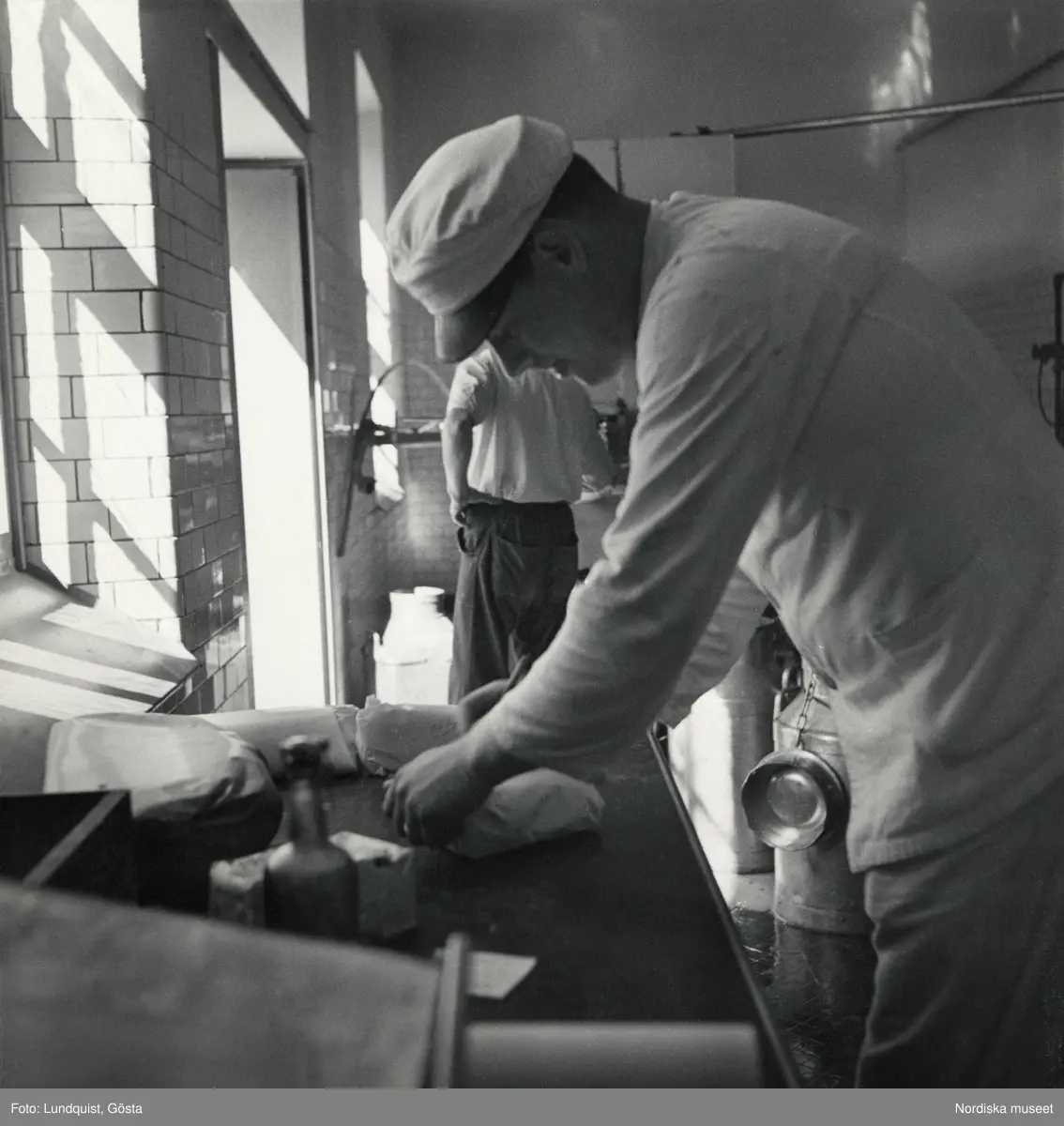 Interiör från mejeriet i Normlösa, Östergötland. En man arbetar med framställnig av smör (eller ost).